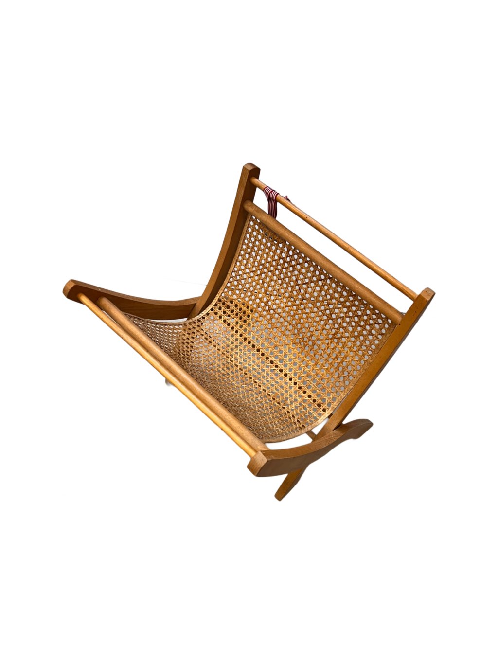 Skládací stojan na noviny z dřevěného masivního dřeva a ratanového výpletu.